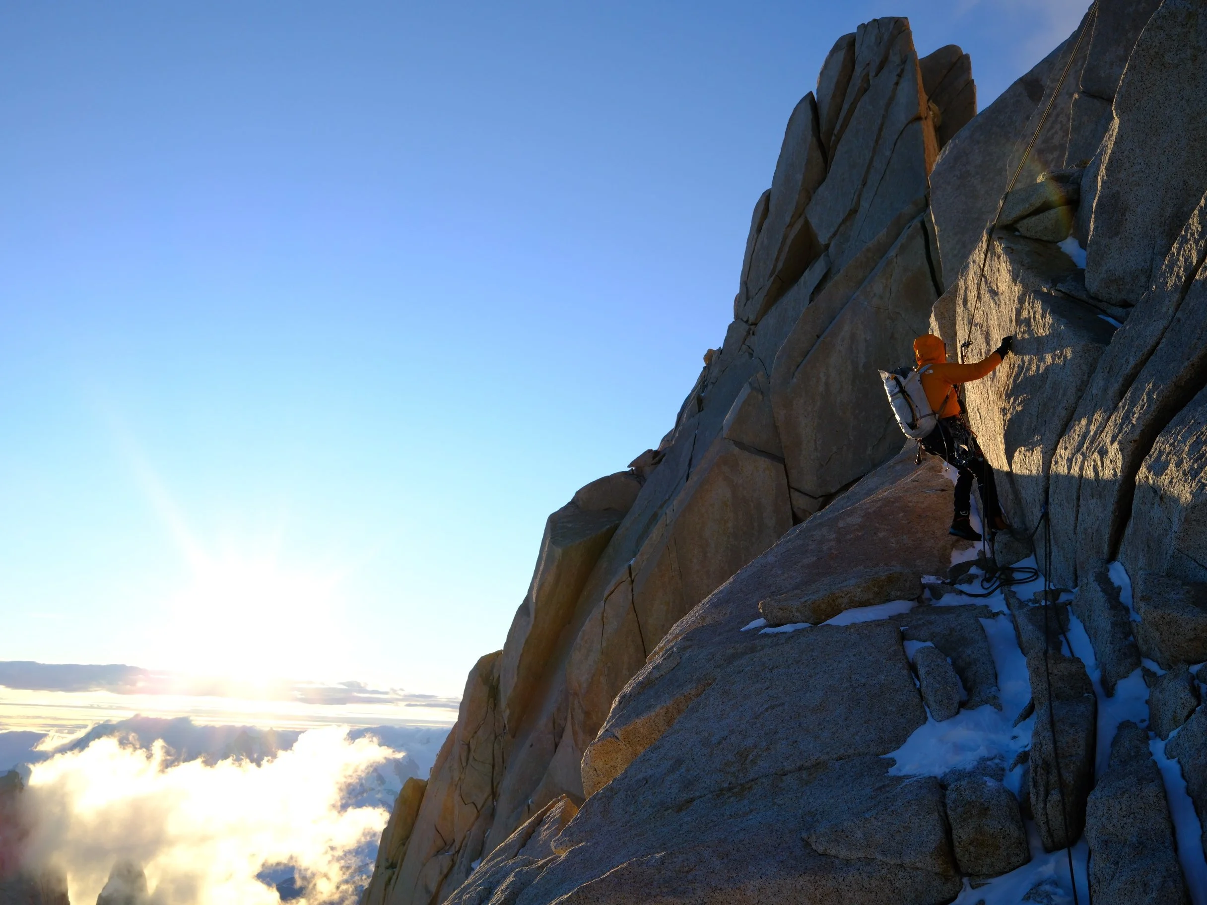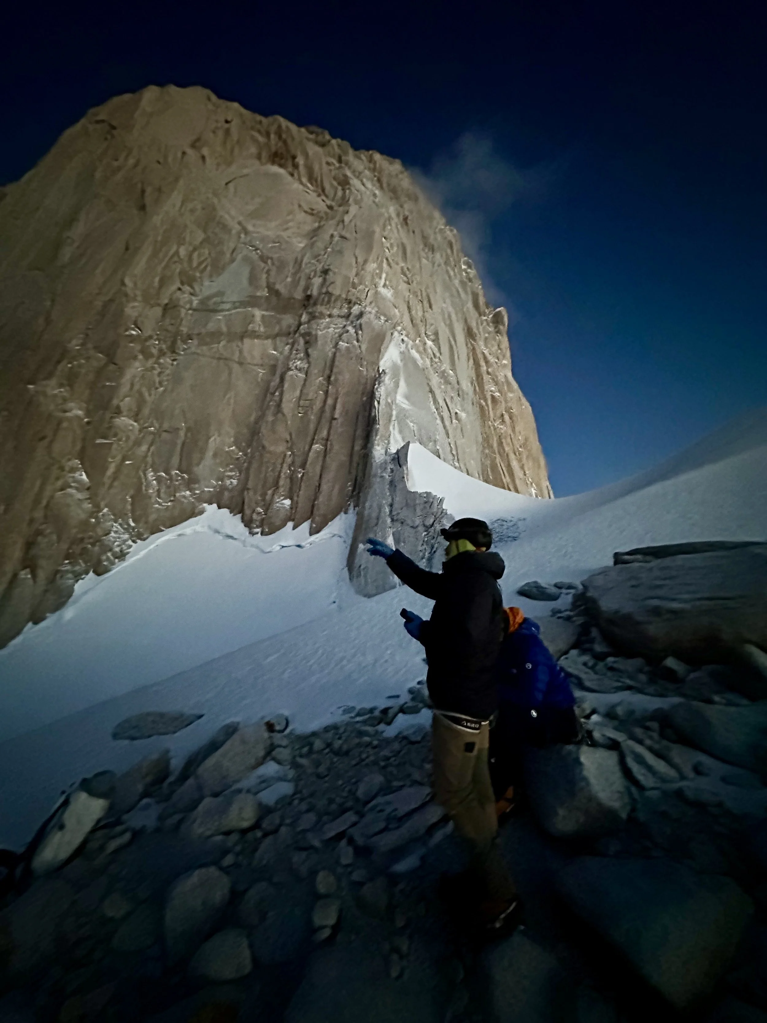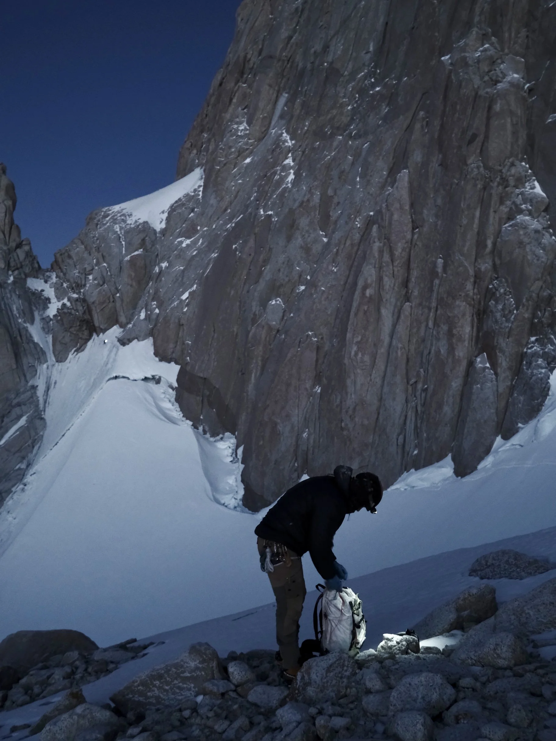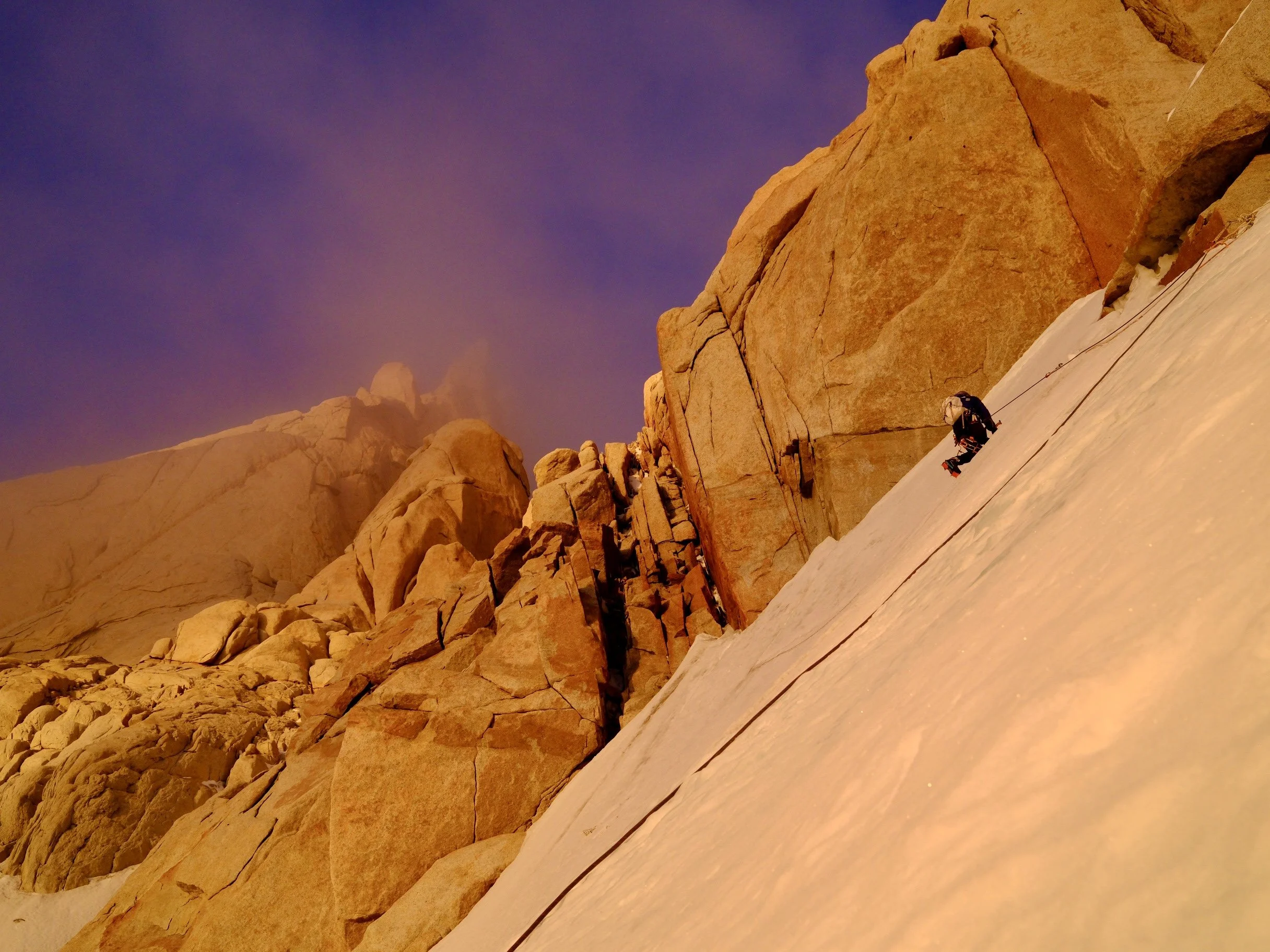 We were forced to leave a couple cams at an anchor to get us to a big snow ledge that we had identified as a key landmark, the point where the Franco-Argentina link-up diverges from the Francesa. It was the first time all night that we knew exactly where we were. The relief poured over us. The stranglehold of night was relinquishing its grip to the first gray light of morning. We looked down and the glacier was close.