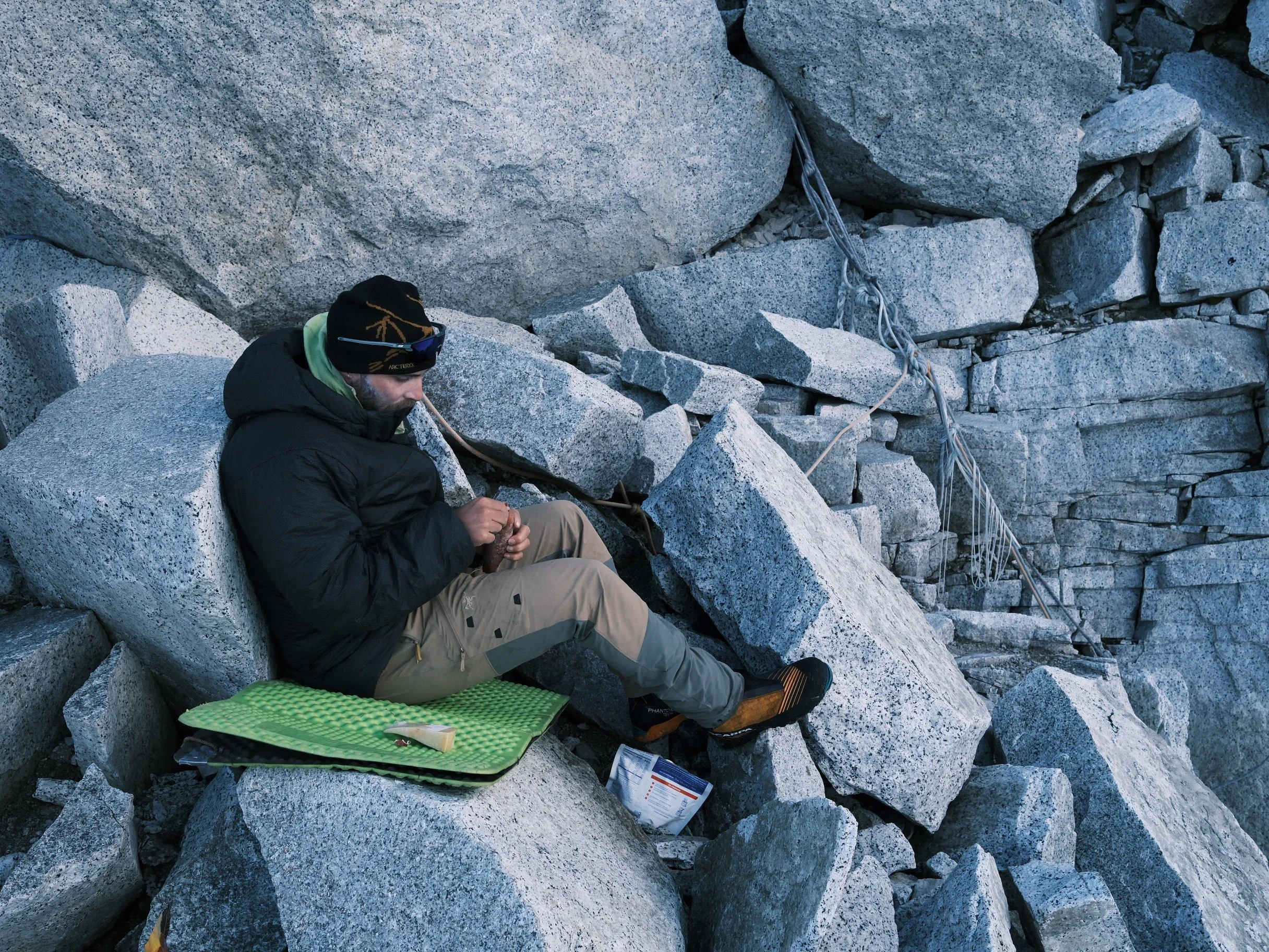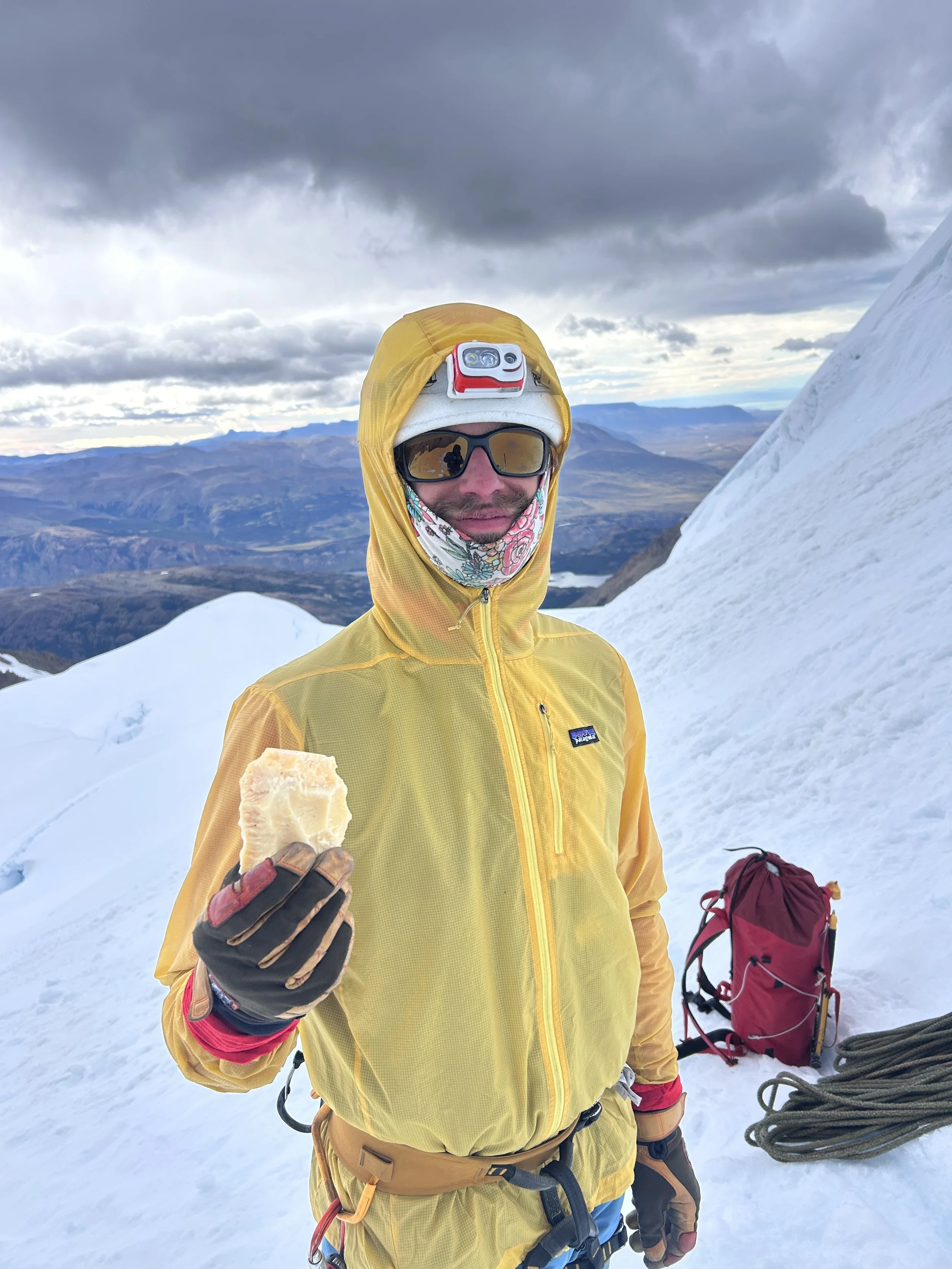 We took a break on the first flat ground we had found since stepping off the glacier. It was 5 AM and the sun was just barely illuminating the horizon. Brad reached into his backpack and found a disaster. Nearly the entirety of his three-liter water reservoir had emptied itself into his pack, soaking everything. He turned his climbing shoes upside down and water gushed out. He wrung his gloves dry and pulled on his saturated down jacket in an attempt to dry it out with body heat. Worst of all, the block of parmesan had been sitting in the bottom of the bag. We passed the block around and took bites off it like we were eating an apple, working through the mushy exterior until we decided it would be safer in my pack. That could have been the straw that broke the camel's back, but it did not deter Brad. The thought of bailing did not cross his mind.