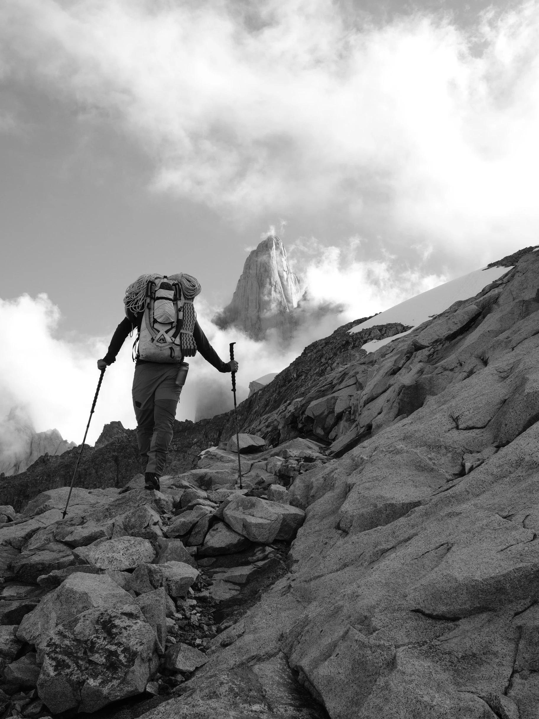 Nate and I woke up the following morning to a heavy cloud that dampened our firecracker motivation. We discussed delaying a day before hiking up to Paso Superior, but we also weighed the benefit of spending time at camp after the long approach to recover before a big climbing push. We hemmed and hawed for a bit until my phone lit up with a text from Hannah: "Good morning! I woke up with an idea. Would it be helpful if I carried a bunch of stuff for you today, as high as it makes sense before turning back to town before dark?"