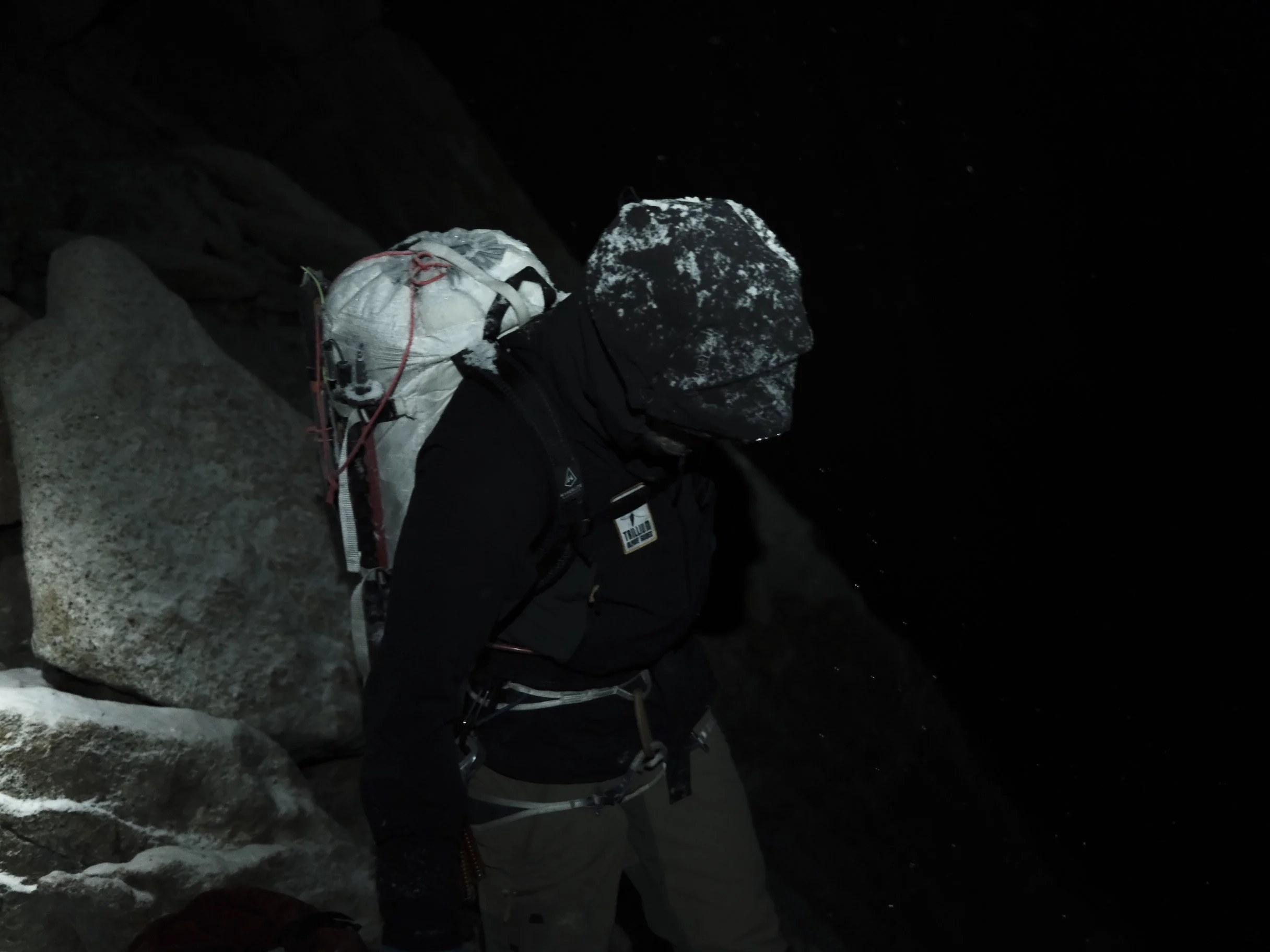 I was the only one with a picture of the rappel line, so I took over. We were all cold but Brad was frigid. Nate helped keep him warm while I led the rappels. Time ceased to exist. My world shrank to the small orb of life illuminated by my headlamp. Finding the next anchor was the only thing that mattered. Like a train barreling through a tunnel with nowhere to go but through. No stopping. It is not an option. Keep moving. Gusts of wind ripped through the night and pummeled us with spindrift. The cold cut through our layers and stiffened our faces. Brad was in a bad way. I offered him the emergency blanket from the medkit. It felt like a pretty empty gesture, but maybe it would provide relief from the wind.