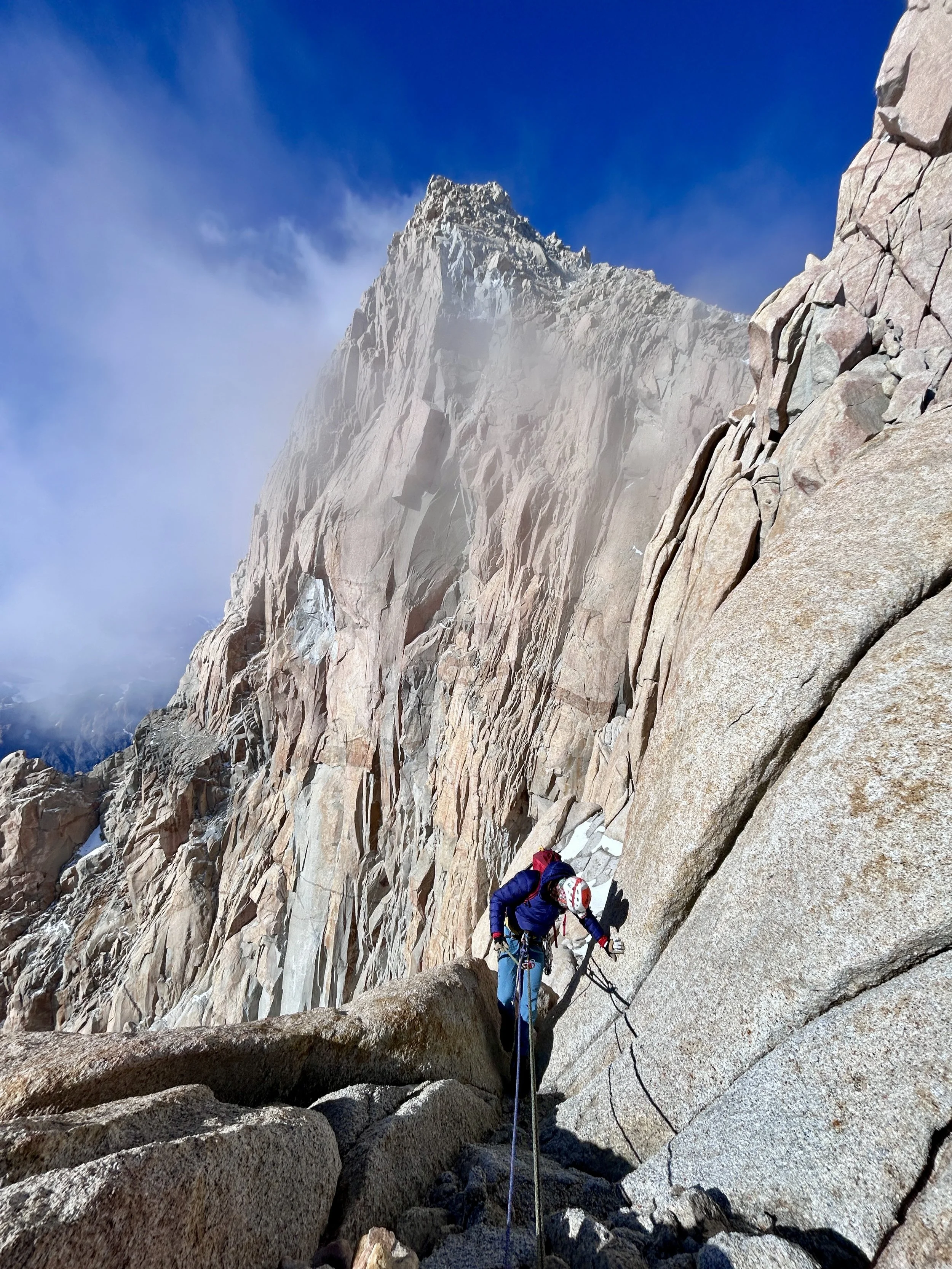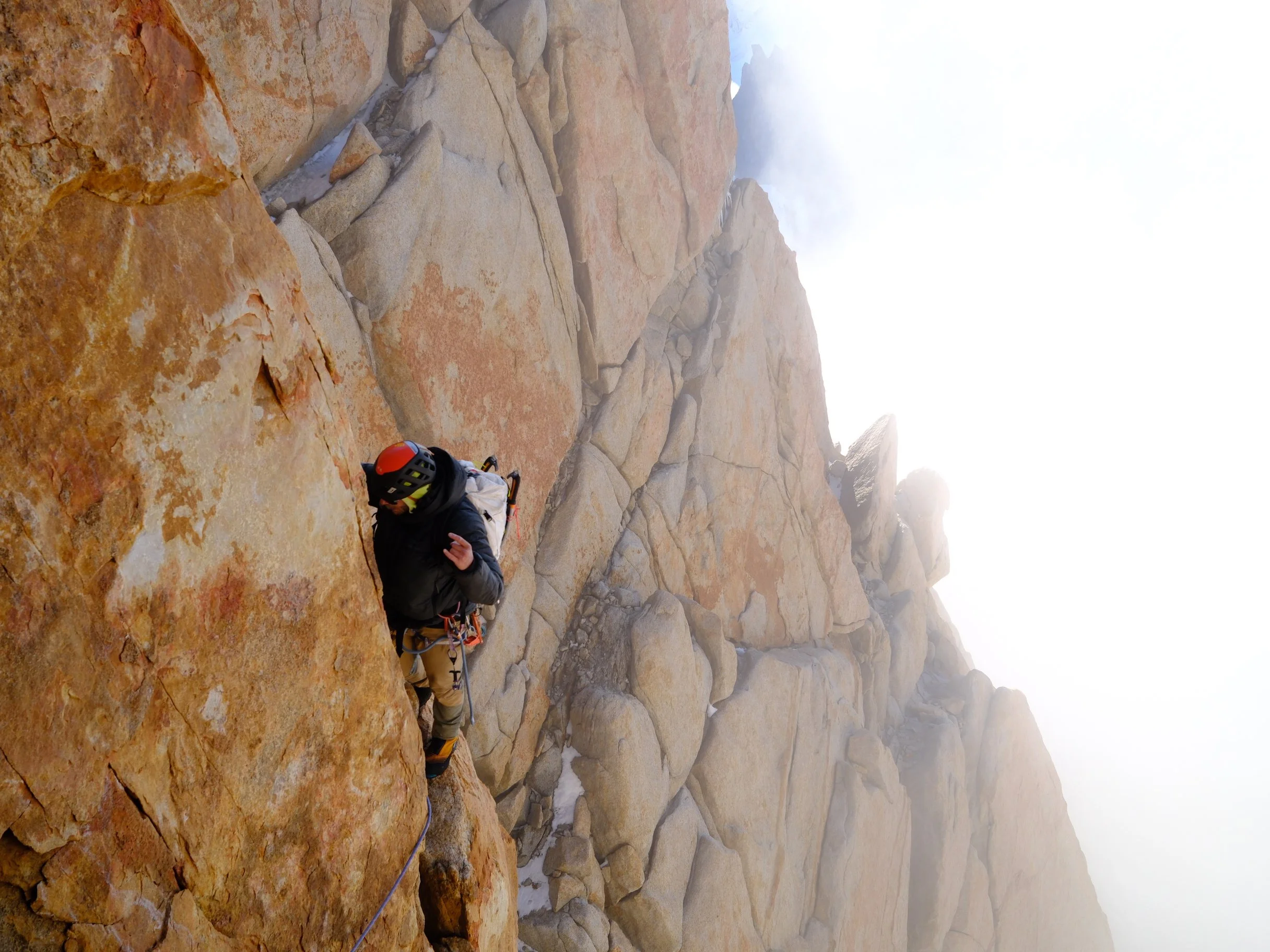 I caught up with the Argentines again, but this time the wall ahead offered several cracks and a real opportunity to pass. They had committed to the widest crack on the far right, which was the only one that looked climbable in mountain boots. I swapped into my rock shoes and blasted up a series of intricate hand and finger cracks on the left. Brilliant climbing. Stemming, jamming, and just a touch of chimneying. Climbing in rock shoes felt like flooring an F1 car, especially after climbing in mountain boots, which is more akin to a baby giraffe learning stick shift in the family sedan. I pushed the rope higher, pitch after pitch. The demand of the sharp end kept my fingers and toes warm, or at least gave me something to think about other than how cold they were.