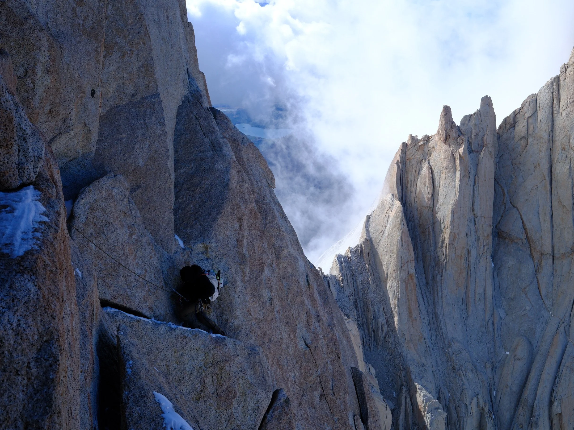 All that stood between us and sleep was rappelling down the Brecha de los Italianos and then a walk back across the glacier to camp. The wind was so strong at the top of the brecha that when we saddlebag-coiled the ropes, they flew up past Nate's ears. We wrestled them down and ducked behind a huge rock. Sheltered on the east side, the rappels down the Brecha de los Italianos were thankfully unremarkable, aside from the eerie feeling cast by the plethora of old, shredded ropes that lined the walls like trophy mounts in a hunter’s shack.