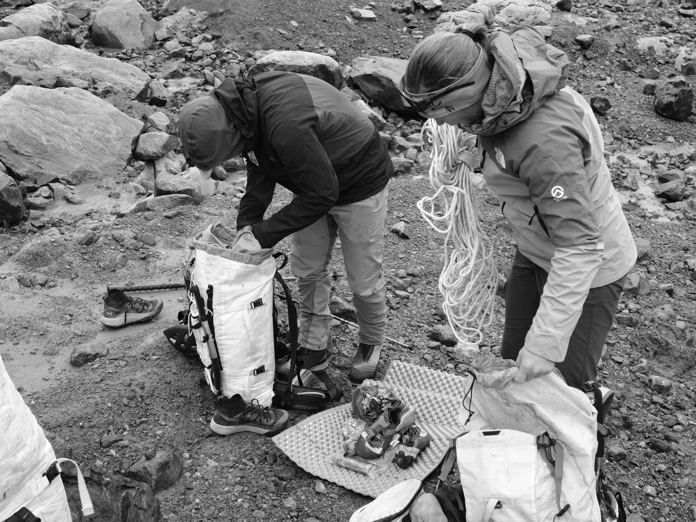 My alarm blared and I rolled over and fired up the stove like a robot switched on to perform a single task. It just feels easier to bypass the brain and simply execute a function at 2 AM. The inertia of a warm sleeping bag is hard to overcome, especially if you think about it too much. We downed our coffee, packed up the final bits, and scrambled down onto the glacier.